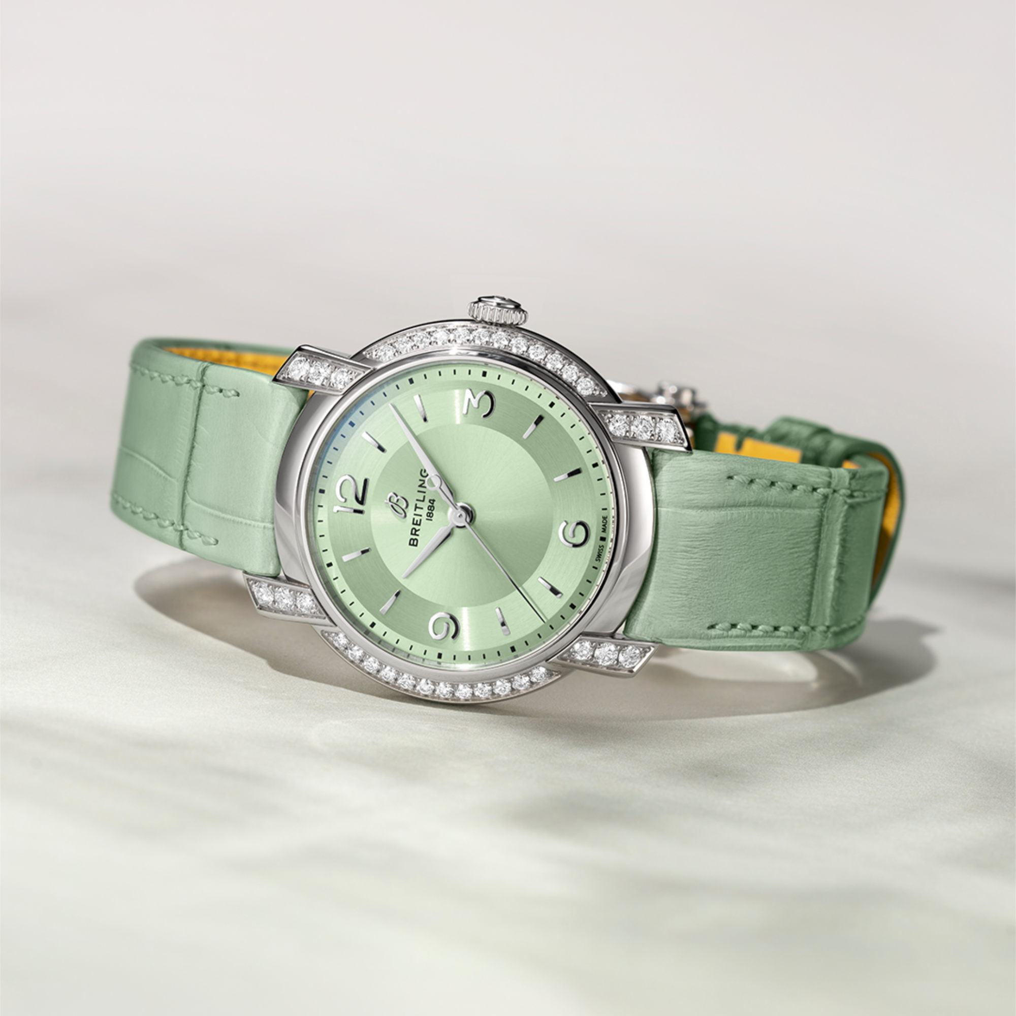 Ref. A10310671L1P1 - In den 1940er-Jahren führte Willy Breitling die Linie Premier ein und machte den Chronographen von einem Präzisionswerkzeug zu einem Ausdruck von Stil, mit raffinierten Materialien, eleganten Details und sogar einem der ersten Chronographen, die speziell für Frauen entworfen wurden. Später wurde seine schicke und charismatische Frau Beatrice zu seiner Muse und zu einer bestimmenden Kraft in der kreativen Ausrichtung der Marke.Nun ist die Zeit gekommen, diese ungekünstelte Eleganz mit der neuen Lady Premier in die Neuzeit zu übertragen. Skulpturale Silhouetten, strahlende Farbtöne und kaskadierende Diamanten definieren die verspielte und dennoch gehobene Designsprache.