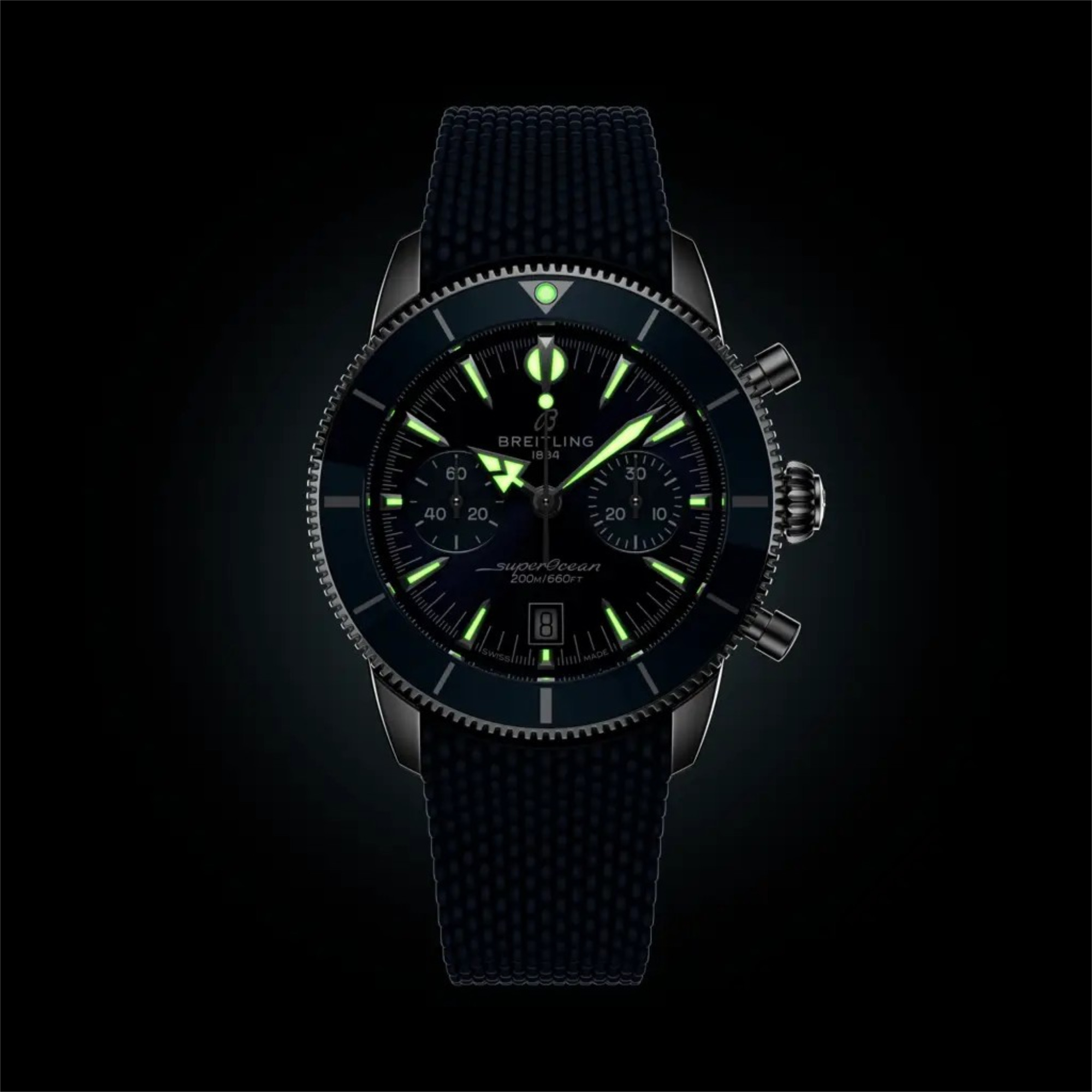 Auch heute noch ist diese Philosophie das Herzstück der Superocean Heritage. Die Seele der 50er Jahre, aber im neuen Kleid für die Gegenwart. Die neueste Superocean Heritage baut auf allem auf, was das Original unverwechselbar gemacht hat, und verfeinert es. Der Chronograph wird vom Breitling-Manufakturkaliber 01 angetrieben, dem branchenführenden Uhrwerk von Breitling. Eine Lünette mit Keramikeinlage bietet außergewöhnliche Kratzfestigkeit, während die integrierten Armbänder aus Mesh-Metall oder Mesh-Kautschuk eng am Gehäuse anliegen und mit Faltschließen für ein sauberes, wasserdichtes Finish gesichert werden. Ton-in-Ton-Hilfszifferblätter, ein diskretes Datumsfenster auf sechs Uhr und die originalen Signaturzeiger Pfeil für die Stunden, Speer für die Minuten – sorgen für Ablesbarkeit und Ausgewogenheit, über oder unter der Oberfläche.