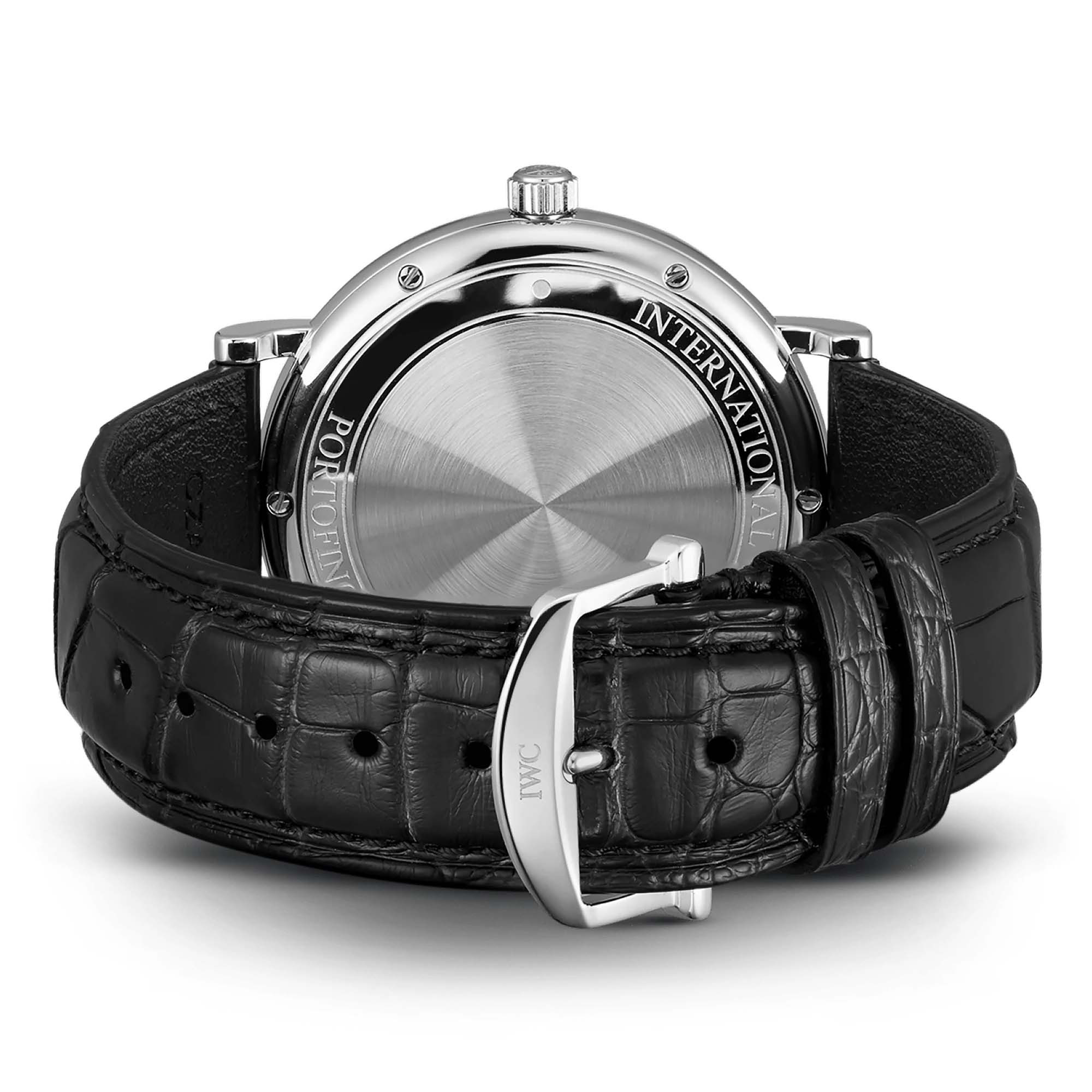 Ref. IW356523 - Seit 1984 bringen die Uhren der Portofino-Familie von IWC die Leichtigkeit der mediterranen Lebensart zusammen mit einen Hauch von Luxus und zeitloser Eleganz ans Handgelenk. Einfache Dreizeigeruhren sind seit der Lancierung der ersten Kollektion ein wichtiger Bestandteil der Linie. Die Portofino Automatic, wie wir sie heute kennen, wurde im Jahr 2003 eingeführt. Dank einer perfekten Symbiose von Einfachheit und Eleganz hat sie sich zu einem der beliebtesten Zeitmesser aus Schaffhausen entwickelt. Jetzt ist das Modell zum ersten Mal in einer unlimitierten Version mit einem Gehäuse aus Edelstahl und einem tiefblauen Zifferblatt erhältlich. Diese Zifferblattfarbe kontrastiert schön mit den vergoldeten Zeigern und Appliken. Getragen wird diese Uhr an einem handgefärbten schwarzen Alligatorleder-Armband.