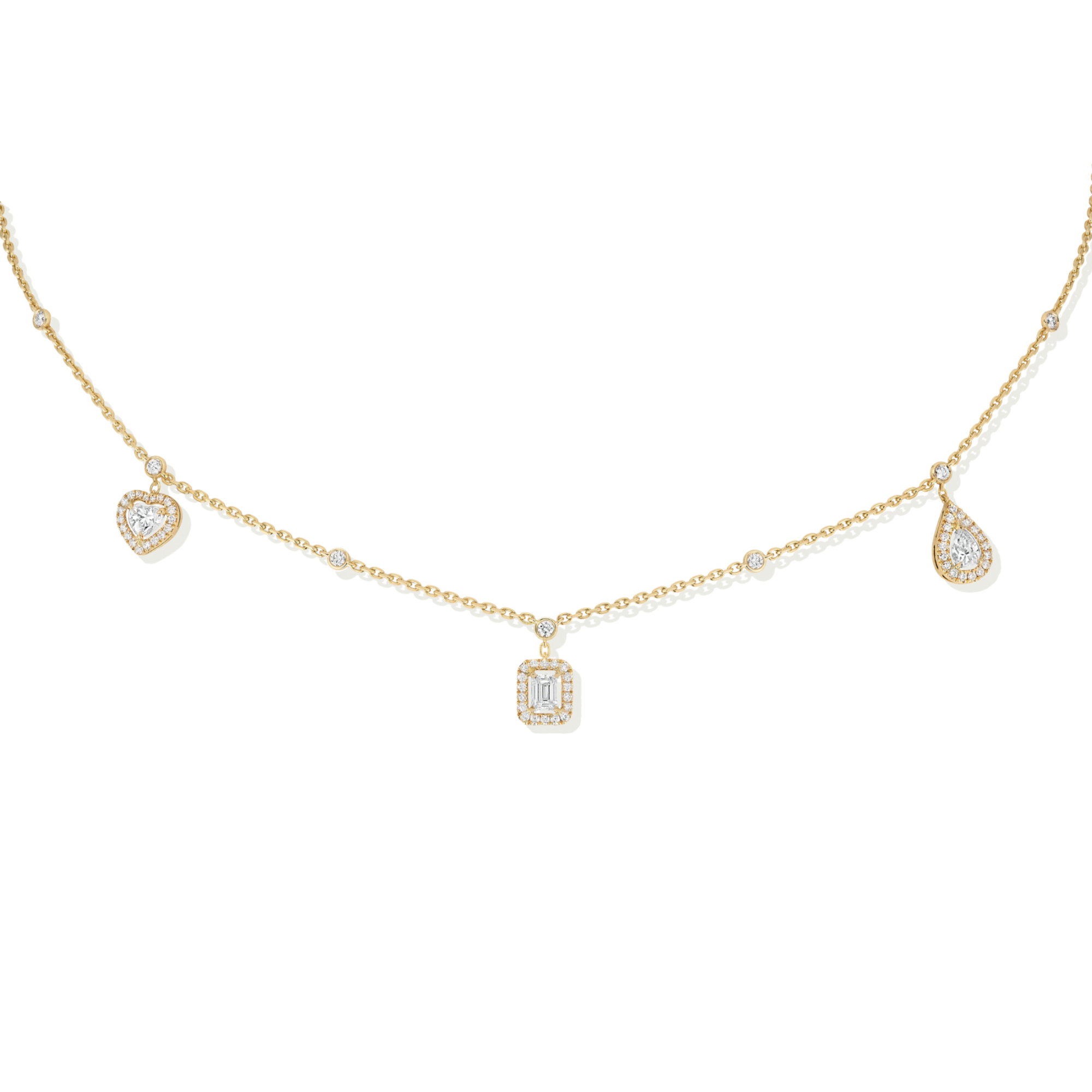 Ref. 11945-YG - Mit seinen drei Diamanten an Quasten spielt diese My Twin Trio Diamantkette aus Gelbgold nach Lust und Laune mit den Formen und schmückt sich mit dem Herz-, Smaragd- und Tropfenschliff zugleich. Das zeitlose Schmuckstück wird Ihr treuer Begleiter für den Alltag werden: Er eignet sich sowohl für ein elegantes Abendoutfit als auch für einen lässigen Look mit T-Shirt und Jeans. Es verleiht jedem Stil das gewisse Etwas! Die Magie des Messika Schmucks: Luxus-Schmuckstücke, die sich ganz an Ihre Stimmungen im Alltag anpassen.