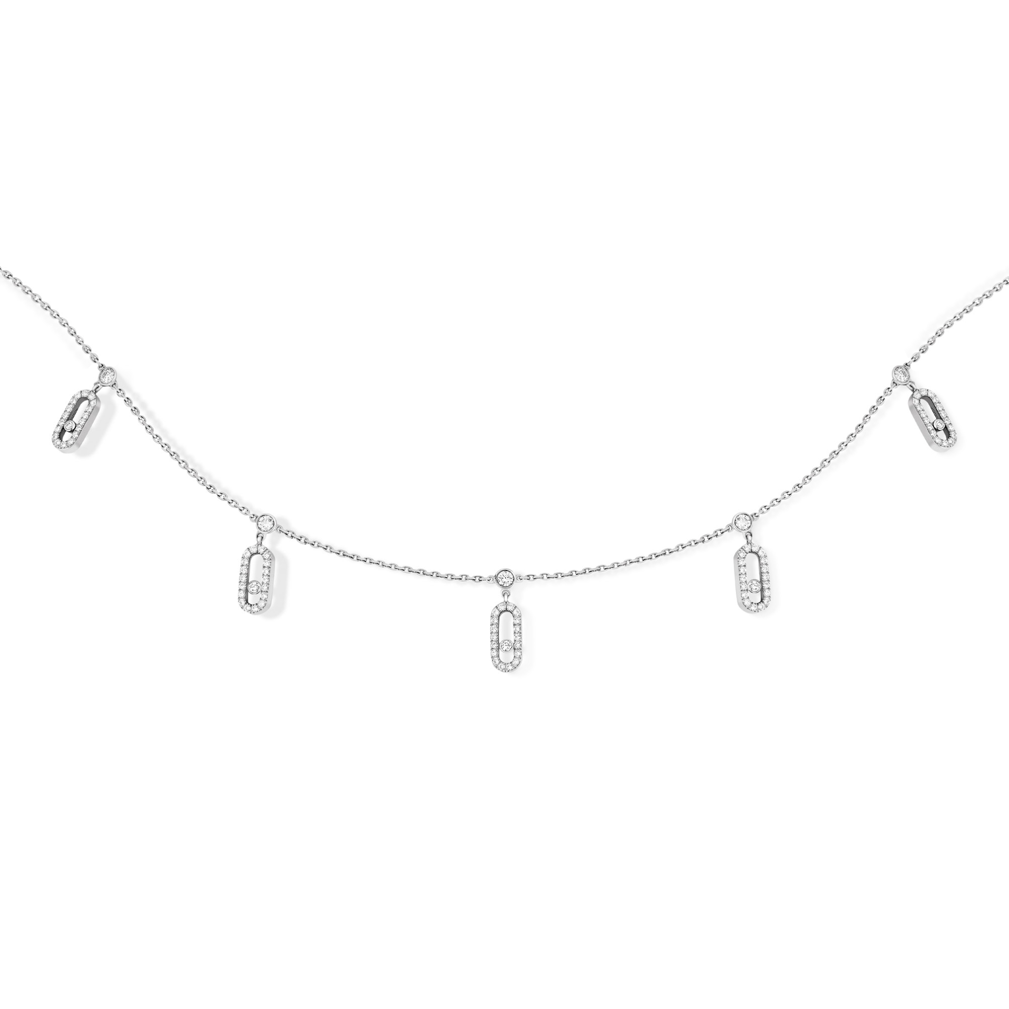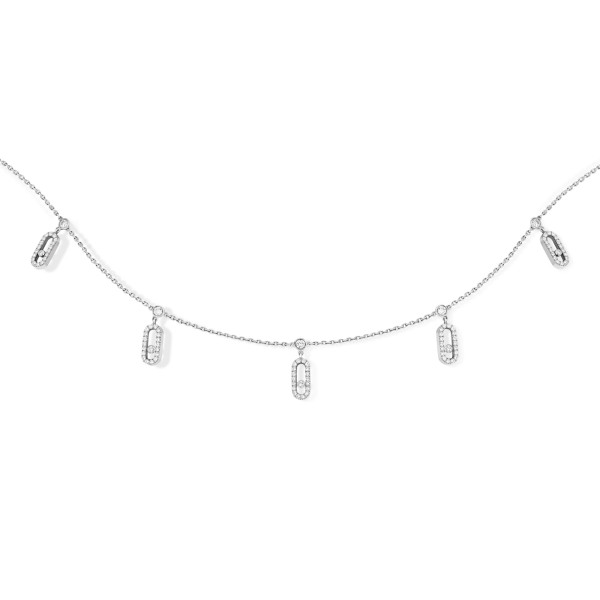Ref. 12150-WG - Lassen Sie sich von der Move Uno Halskette mit Quasten aus Weißgold und Diamanten verführen! Sie ist aus 18 Karat Weißgold gefertigt und besteht aus einer feinen Kette, an der 5 Move Uno-Charms aus schillernden Diamanten hängen. Als Ode an die funkelnden Lichterspiele der Diamanten besticht sie durch ihre sanfte Geschmeidigkeit und Bewegung, die sie charakterisieren. Dank ihres Designs mit einem Karabinerverschluss mit Schiebesystem können Sie die Kette als Choker oder Halskette tragen.
