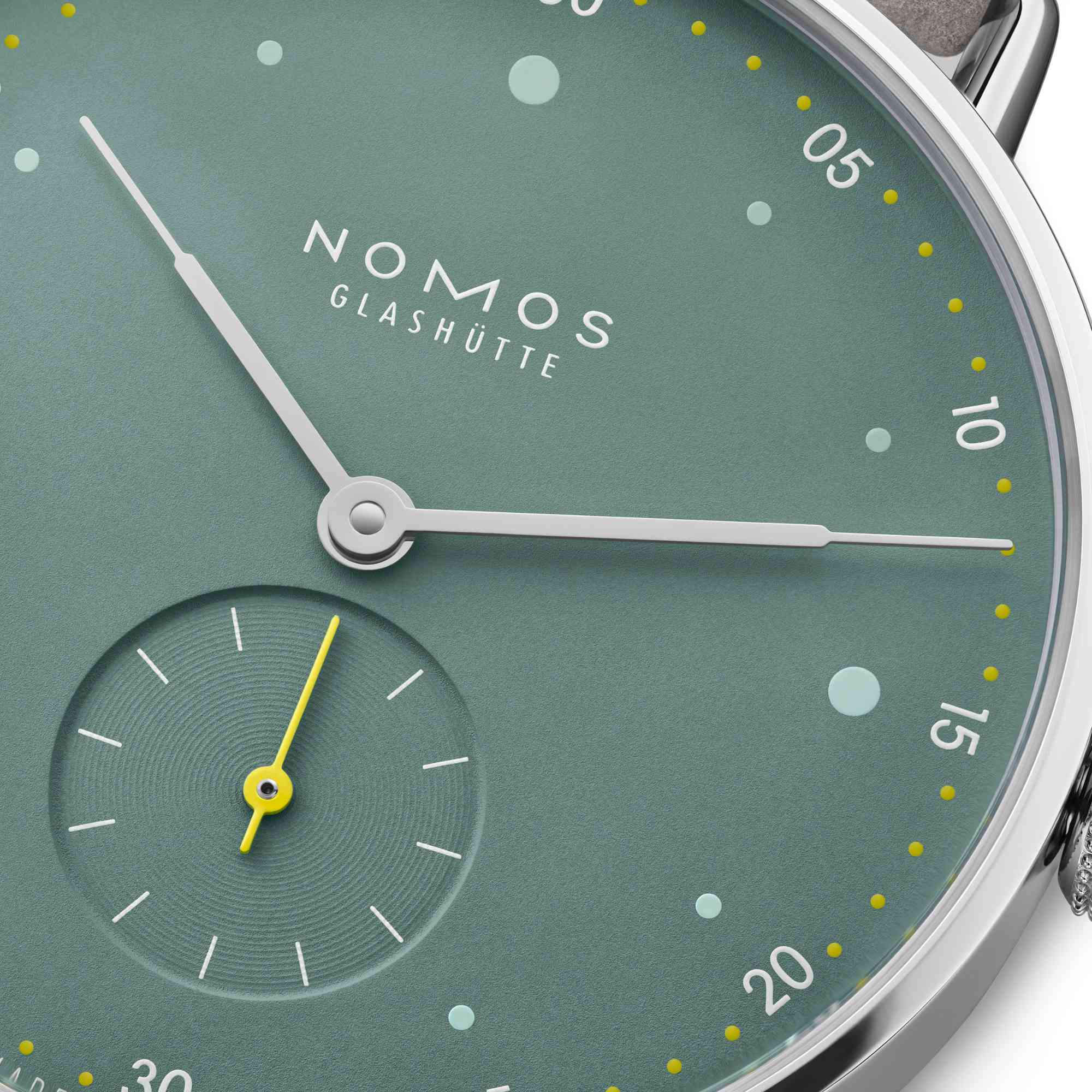 Galvanisiert, salbeigrün, arabisch, Stundenindizes bei drei, neun und zwölf Uhr mint, Minuterie gelb