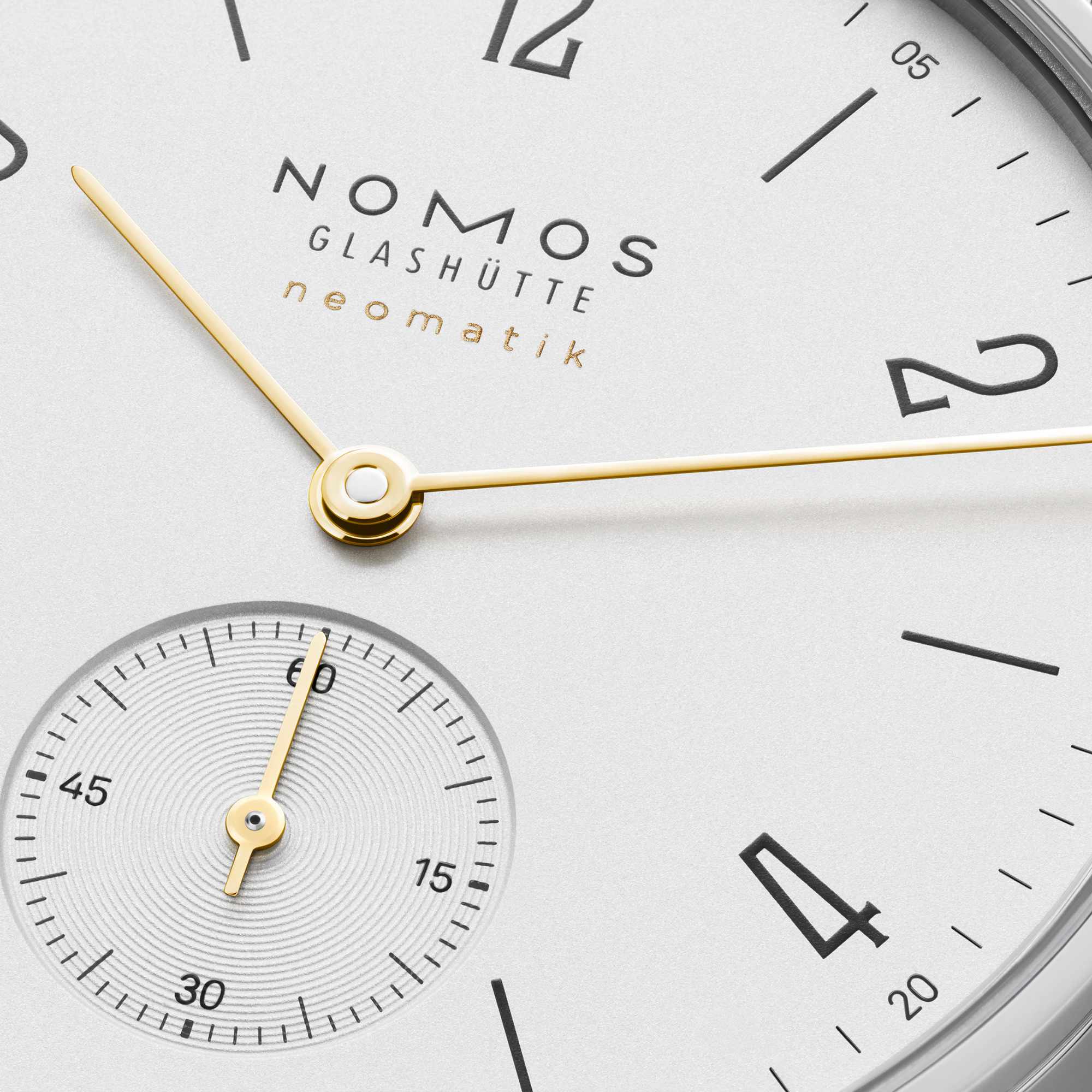 Ref. 192.SB - Tangente ist eine Meisterin darin, Strenge und Eleganz zu vereinen. Als neomatik-Modell mit goldenen Zeigern schafft die NOMOS-Ikone noch einen weiteren Brückenschlag: Sie verleiht der technischen Überlegenheit dieser Manufakturuhr mit einem Hauch von Gold auf dem Zifferblatt das Quäntchen Glamour, das den Unterschied macht. Eine Uhr für alle Momente des Lebens, auch die festlichsten. In Manufakturqualität mit Glashütter Herkunftsschutz.