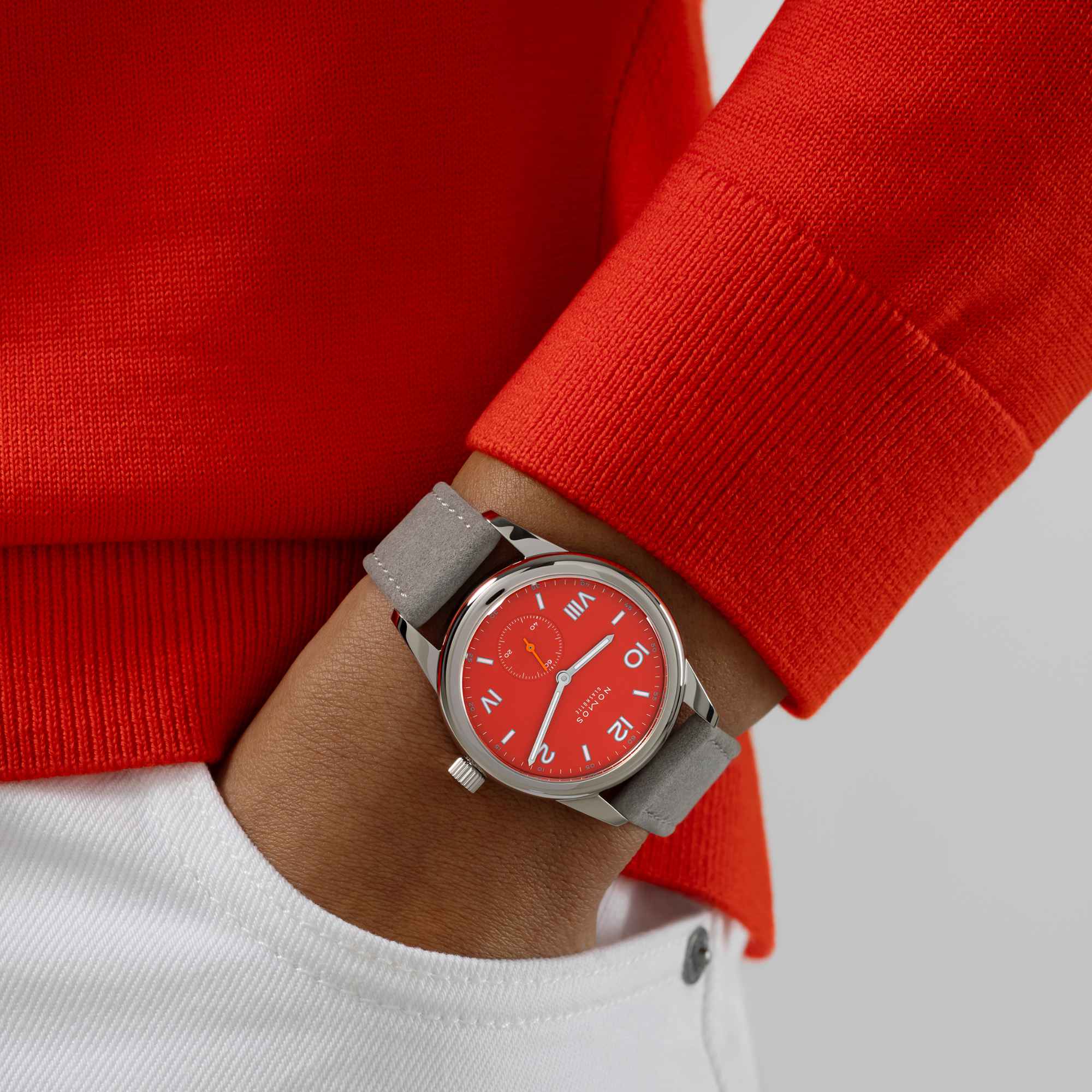 Ref. 716 - Rotsehen erlaubt: Diese Zifferblattfarbe ist präsent, selbstbewusst und unbekümmert laut. In anderen Worten: jung. Ein Mir-gehört-die-Welt-Rot für Menschen, die etwas wollen und einfach loslegen. Klar, deutlich, mit zuverlässigem Handaufzugskaliber aus eigener Glashütter Manufaktur und am veganen Band – zeitgemäß der Zukunft zugewandt. Besonders schön als Jahrgangsuhr, zur Markierung eines Herzensereignisses oder als Geschenk zu einem bestandenen Abschluss.
