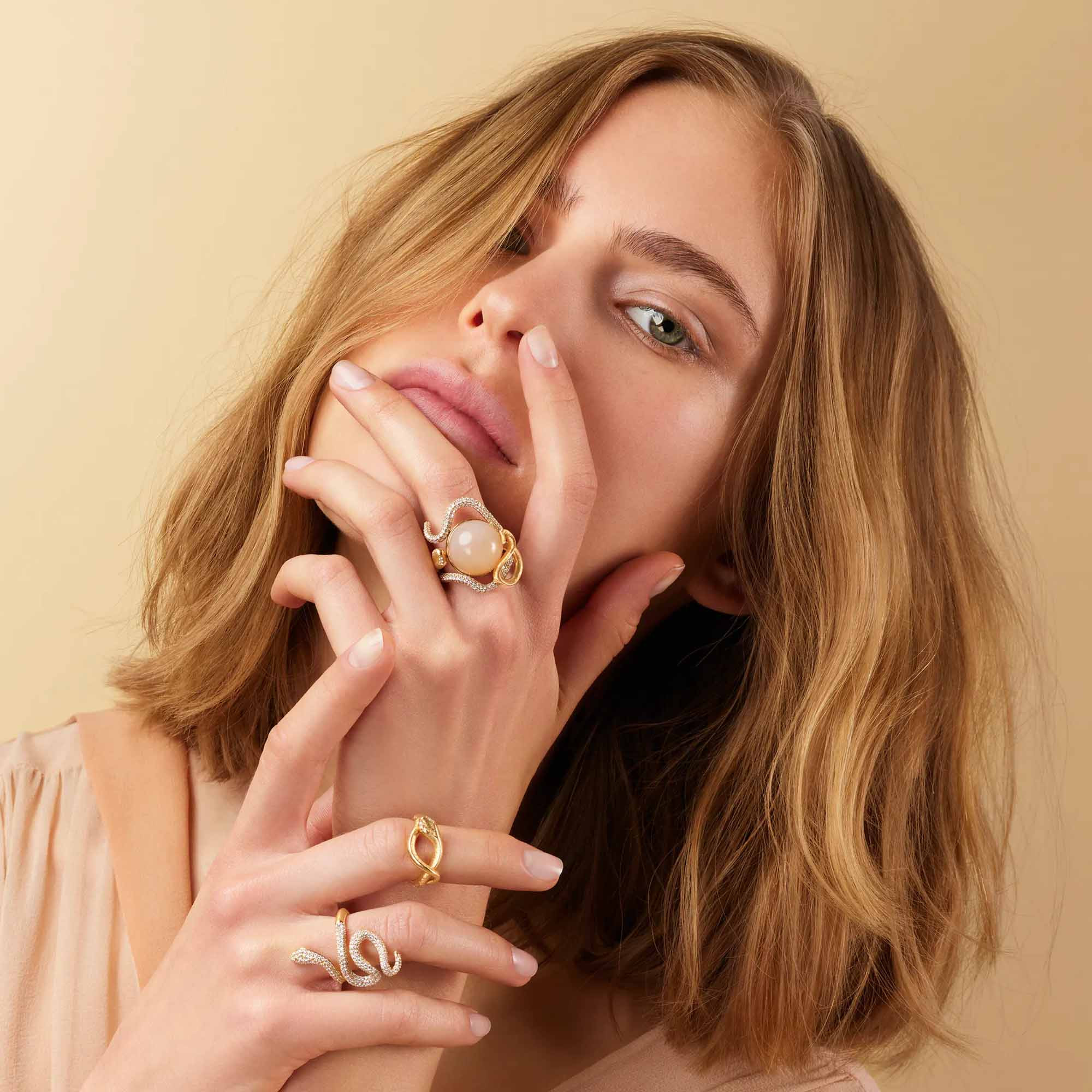 Inspiriert von Schätzen, die ihn wenige Jahre zuvor im Ägyptischen Museum in Kairo so fasziniert hatten, schuf Ole Lynggaard 1969 seinen ersten sinnlichen Schlangenschmuck. Mit Snakes hat er seinen traumhaften, sinnlichen Stil wieder aufgenommen. Snakes ist die Jubiläumskollektion zum 50. Jahrestag von OLE LYNGGAARD COPENHAGEN. Aus diesem besonderen Anlass wurde in jedes einzelne Schmuckstück ein diskretes Jubiläumslogo eingestempelt. Ringe, Ohrhänger, Spangen, Spot und Anhänger der Kollektion Snakes gibt es aus 18 kt Rotgold und Weißgold. Sie schlängeln sich in ihrer einfachen Form um Finger und Hals oder erhalten mit Diamanten und Turmalin-Tropfen einen noch exklusiveren und extravaganten Charakter.