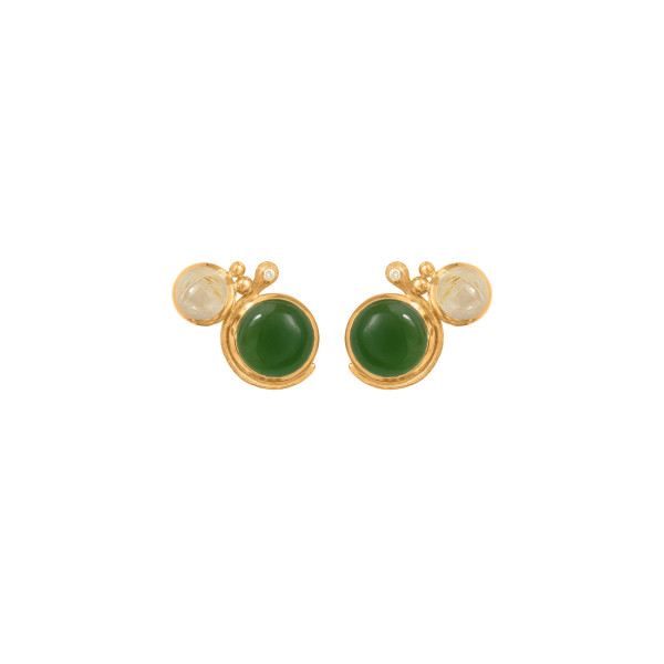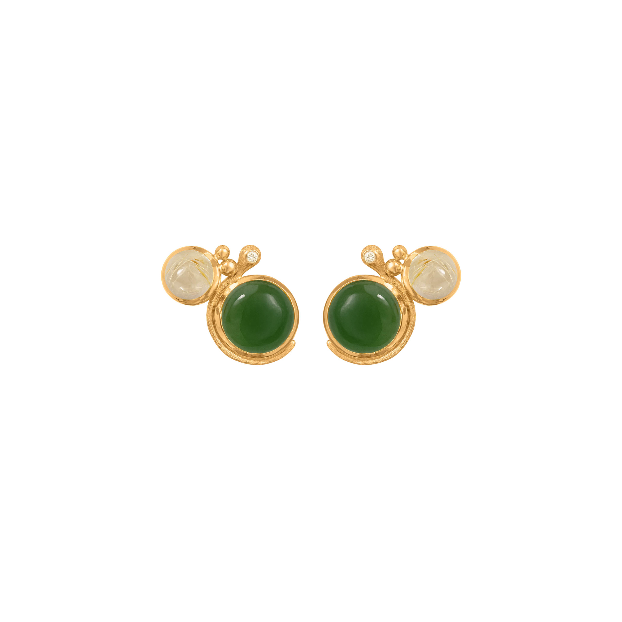 Ref. A2932-403 - Die von Charlotte Lynggaard entworfenen Lotus-Ohrringe sind aus 750/- Gelbgold mit Rutil 6 mm und Serpentin 9 mm und 2 Diamanten von insgesamt 0,02ct. TW. VS. gefertigt. Handgefertigt von Goldschmiedemeistern. 2 Ösen für Anhänger. Verkauf als Paar. Teil der Lotus Kollektion.