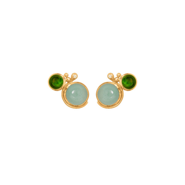 Ref. A2932-404 - Die von Charlotte Lynggaard entworfenen Lotus-Ohrringe sind aus 750/- Gelbgold mit grünem Turmalin 6 mm und Aquamarin 9 mm und 2 Diamanten von insgesamt 0,02ct. TW. VS. gefertigt. Handgefertigt von Goldschmiedemeistern. 2 Ösen für Anhänger. Verkauf als Paar. Teil der Lotus Kollektion.