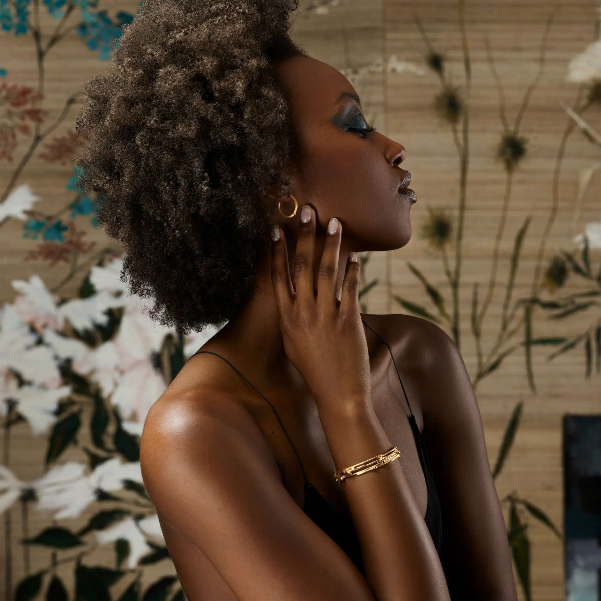 Ref. A2949-401 - Der von Charlotte Lynggaard entworfene BoHo Armreif ist aus 750/- Gelbgold mit drei Diamanten von 0,03 carat TW. VS. gefertigt. Von Goldschmiedemeistern handgefertigt, hat er einen Umfang von 15-16 cm, mit sichtbaren Goldoberflächen, die gehämmert und satiniert sind, um matte Texturen zu erzielen, während die Innenseite des Armreifs poliert ist. Teil der BoHo Kollektion.
