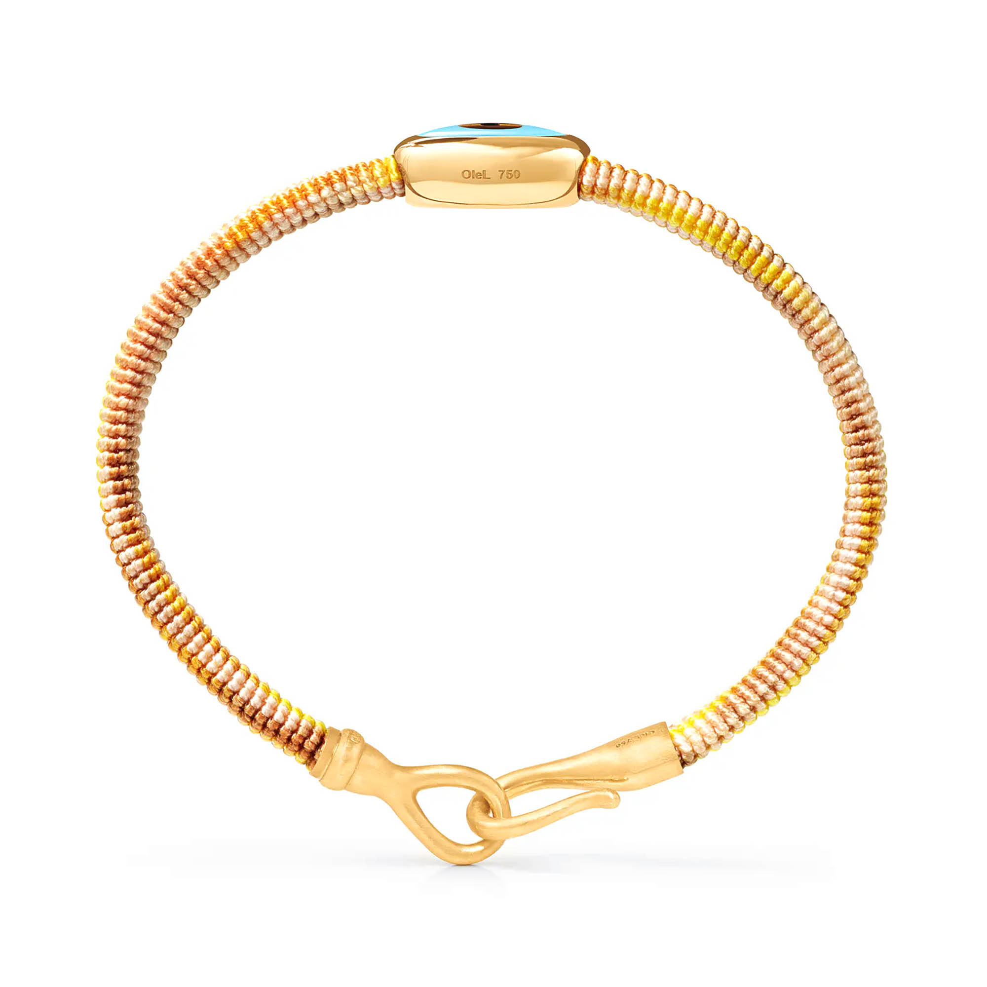 Ref. A2954-407 - Das von Charlotte Lynggaard entworfene goldene Life Armband mit Evil Eye-Charmanhänger ist aus 11 Fäden handgeknüpft, die jeweils aus 6 handgefärbten Fäden gewebt sind. Der markengeprägte Hakenverschluss wird von Goldschmiedemeistern aus gebürstetem 750/- Gelbgold handgefertigt. Der 13x9x2,5mm große Evil Eye ist in poliertes 750/- Gelbgold gefasst. Armband misst 6 mm in der Breite und ist in Längen von 15, 16, 17, 18, 19, 20 oder 21 cm erhältlich. Teil der Life Collection.