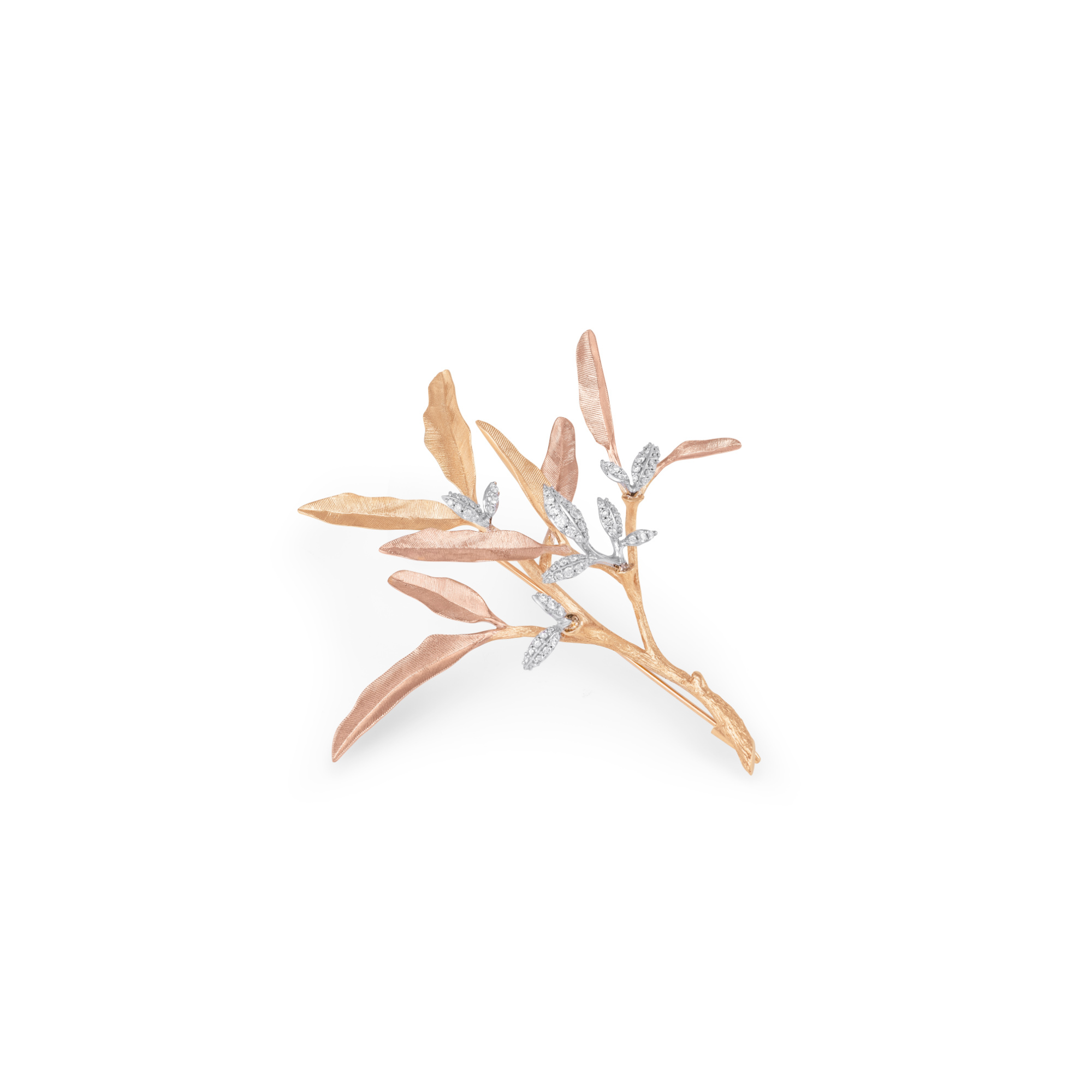 Ref. A3084-401 - Die von Charlotte Lynggaard entworfene Leaves Ast-Brosche klein ist aus 750/- Gelbgold gefertigt und mit 71 Diamanten in Pavé-Fassung in verschiedenen Größen versehen, die sich den Formen der Blätter anpassen - insgesamt 0,38 carat TW. VS. Mit verschiedenen Techniken und Werkzeugen formen und veredeln Meistergoldschmiede die Oberflächen der zarten Roségold- und Gelbgoldblätter von Hand. Teil der Leaves Collection.