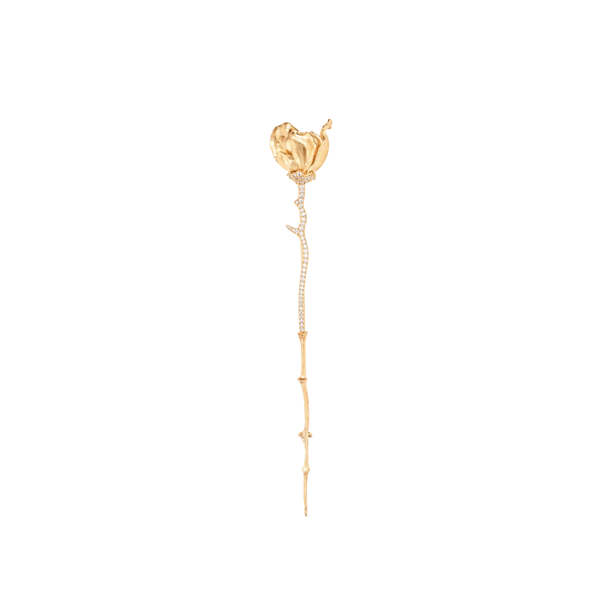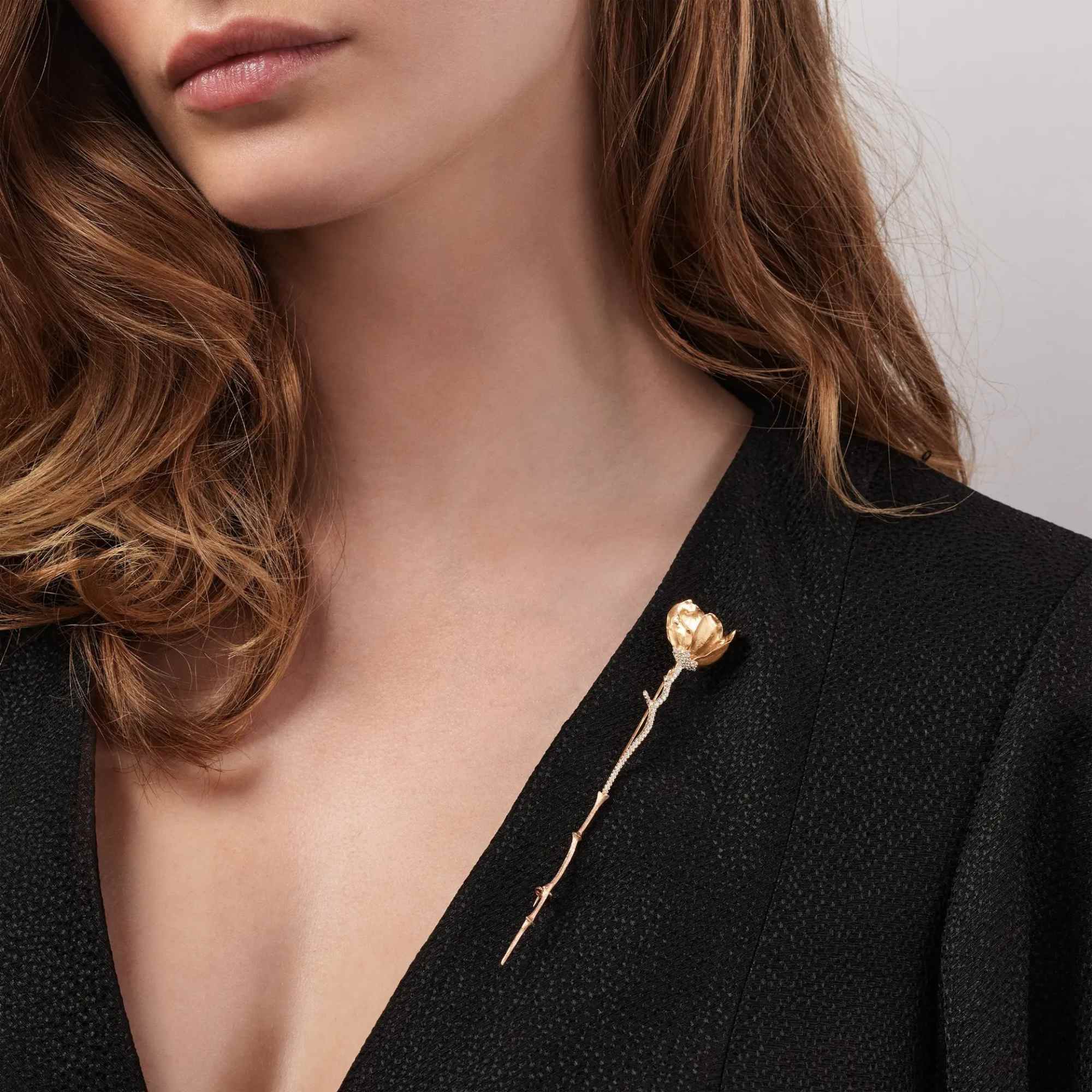 Ref. A3133-401 - Dieser von Charlotte Lynggaard entworfene Wild Rose-Brosche ist aus 18-karätigem Gelbgold gefertigt und mit 59 Diamanten von insgesamt 0,42 Karat TW/VS besetzt. Goldschmiedemeister ritzen und hämmern das Gold von Hand und polieren die Kanten, um einen Kontrast zu schaffen und die Feinheit des floralen Designs hervorzuheben. Die Gesamtlänge der Brosche beträgt 12 cm. Teil der Wild Rose-Kollektion.