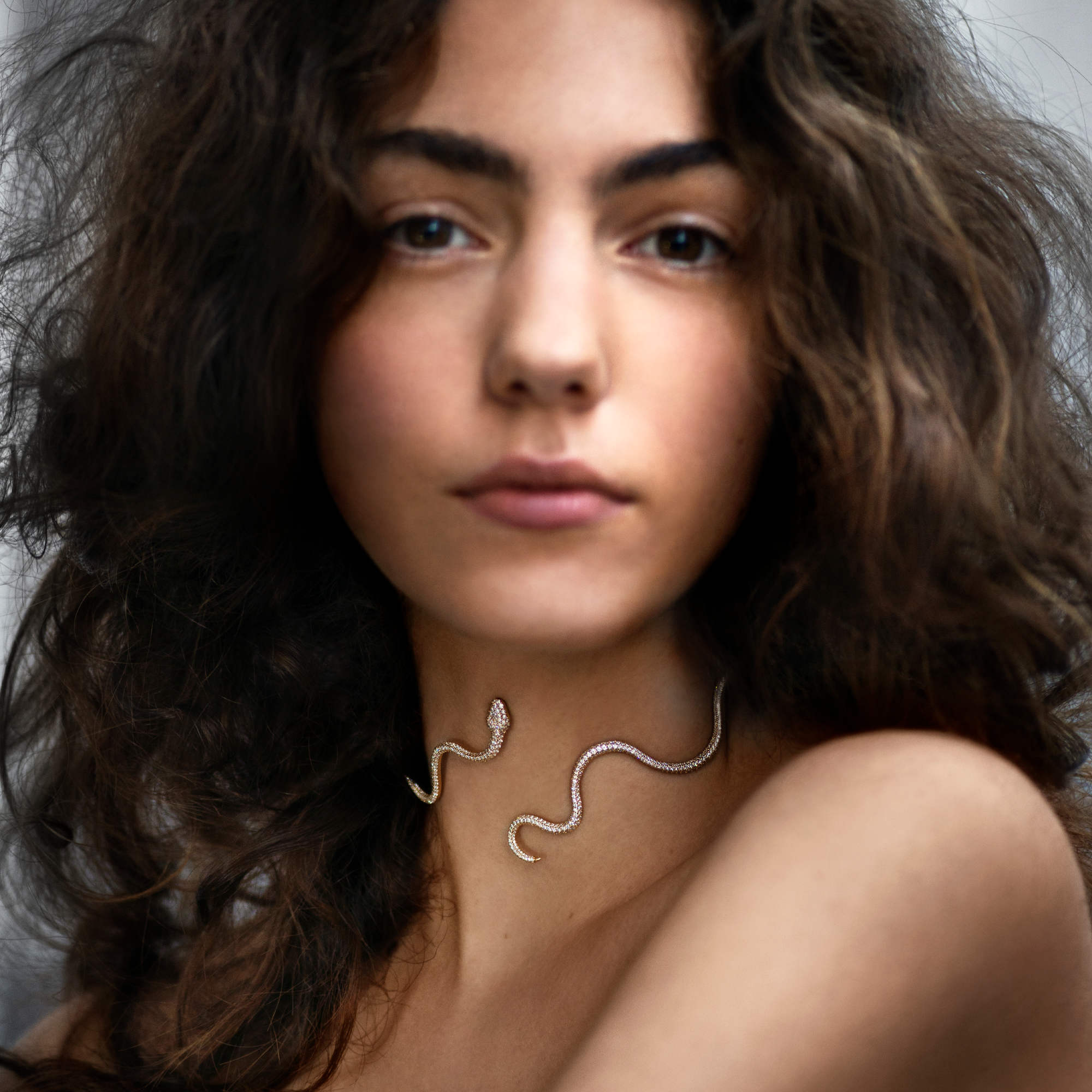 Ref. A9997-462 - Entworfen von Ole Lynggaard. Der Snakes Halsreif mit Diamant-Pavé ist aus 18 Karat Gelbgold gefertigt, mit 850 Diamanten in Pavé-Fassung in verschiedenen Größen, die sich der Form des 33-cm-Halsreifs anpassen, insgesamt 5,09 ct. TW. VS. Handgefertigt von Goldschmiedemeistern. Teil der Snakes Collection.