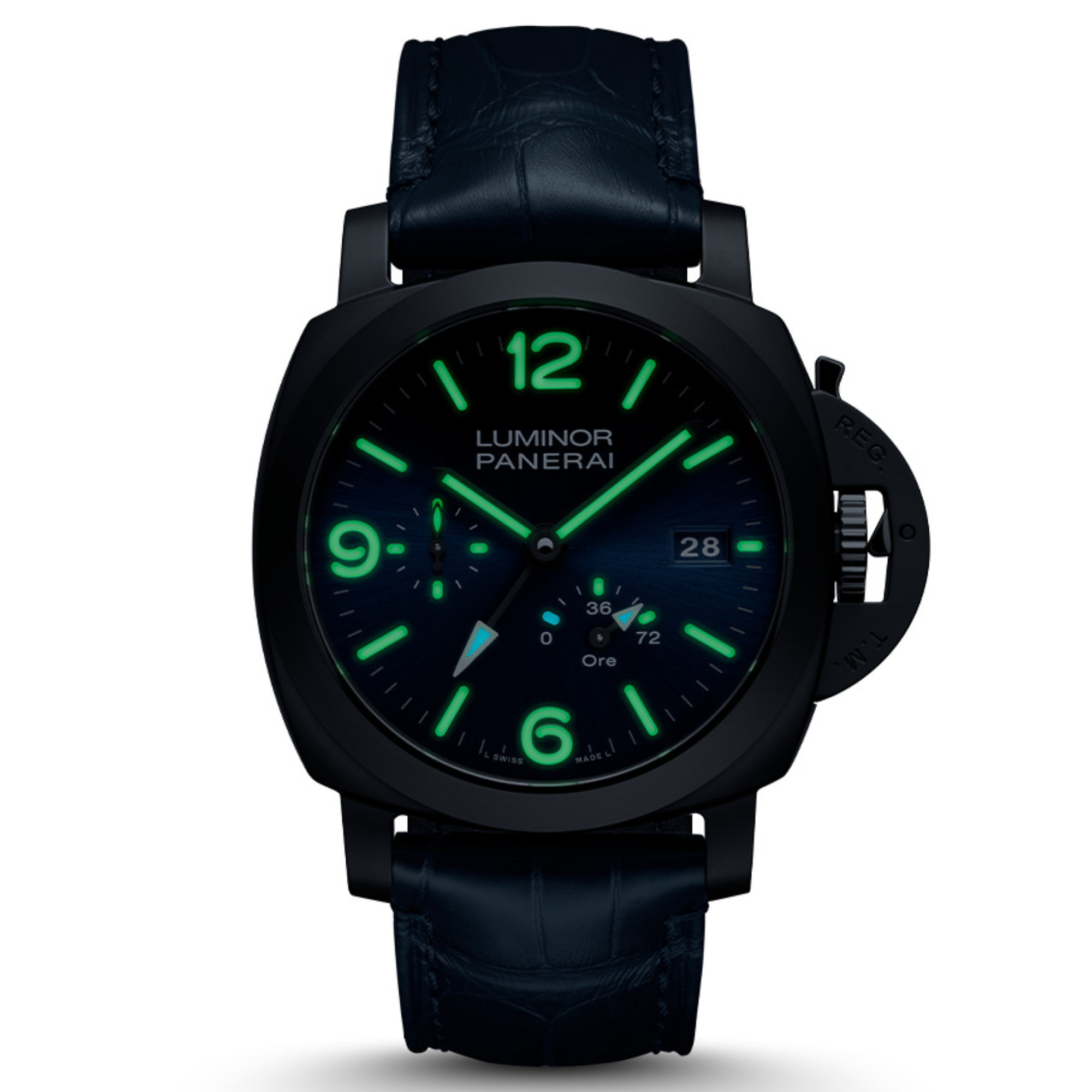 Dunkelblaues Alligatorlederarmband mit Dornschließe aus Titan mit DLC-Beschichtung, Schnellentriegelungssystem