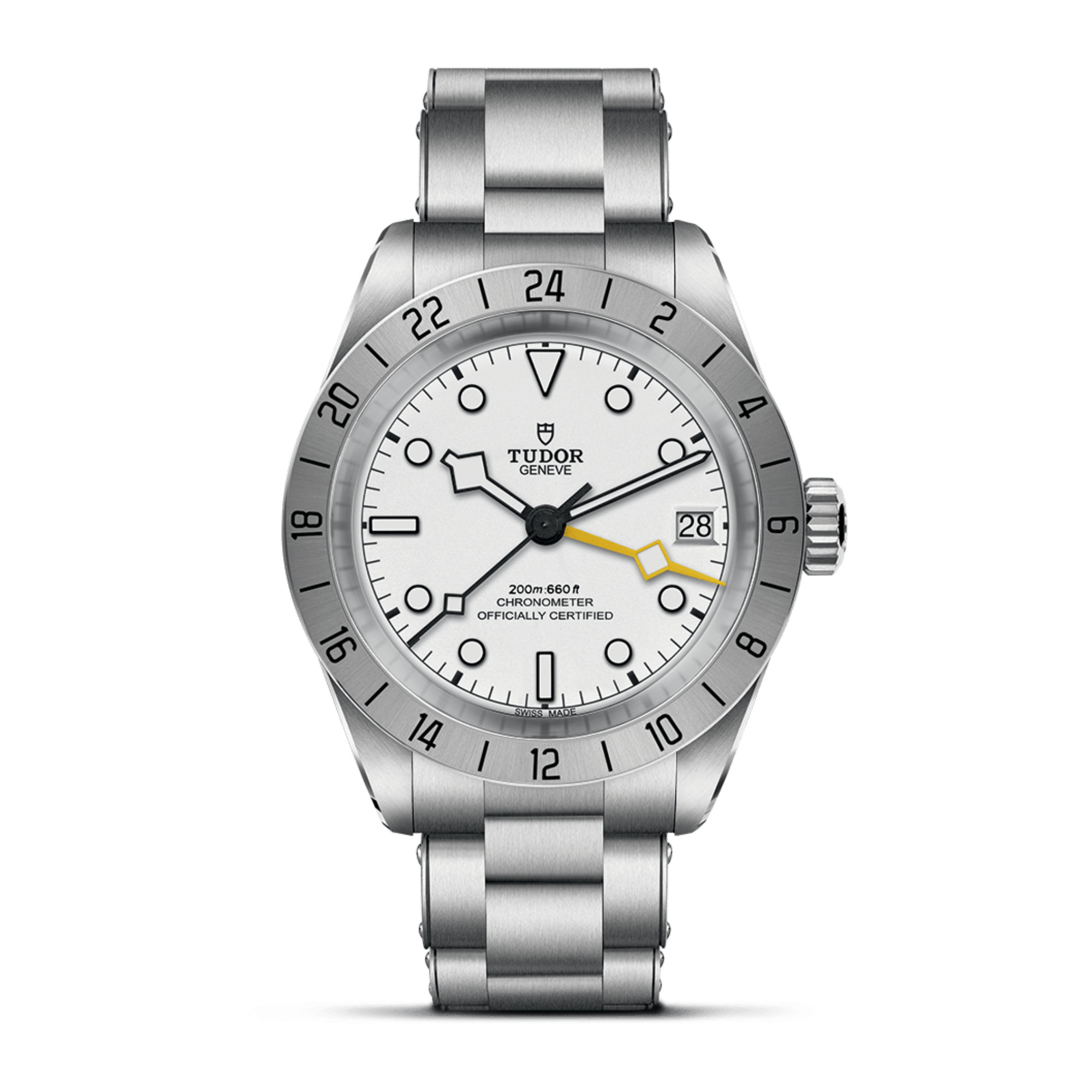 Ref. M79470-0004 - Die Black Bay Pro ist eine robuste Armbanduhr mit einer satinierten feststehenden Lünette mit 24‑Stunden-Graduierung und einem gelben 24‑Stunden-„Snowflake“-Zeiger sowie dem TUDOR Manufakturwerk Kaliber MT5652 mit eingebauter GMT-Funktion. Nun geht TUDOR beim Design noch einen Schritt weiter – mit einem besser ablesbaren opalfarbenen Zifferblatt. Zudem sind die Stundenindizes aus Keramik und die Zeiger schwarz umrandet, was einen starken Kontrast erzeugt. Dank ihrer optimalen Ablesbarkeit ist diese Uhr für jede Art von Forschung geeignet – sei es im Polareis oder in den Tiefen unterirdischer Höhlen.